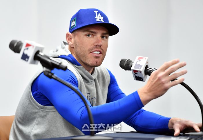 다저스 프레디 프리먼이 16일 서울 고척스카이돔에서 진행되는 MLB 서울시리즈 LA 다저스 공식 기자회견에서 기자들 질문에 답하고 있다. 사진 | 스포츠서울DB