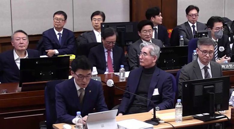윤석열 전 대통령과 김용현 전 국방부 장관 등이 9일 오전 서울 서초구 서울중앙지방법원에서 열린 윤 전 대통령의 내란 우두머리 혐의, 김 전 장관을 비롯한 군·경 수뇌부 7명의 내란 중요임무 종사 혐의 등 사건의 결심 공판에 참석해 있다. 서울중앙지법 제공