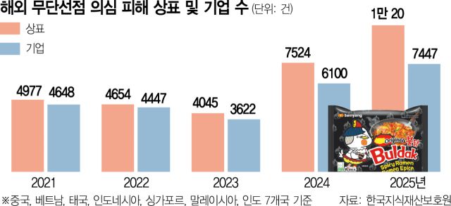11일 한국지식재산보호원에 따르면 중국·베트남·인도네시아·태국·싱가포르·말레이시아·인도 등 해외 7개국에서 무단 선점이 의심되는 한국 상표 피해 건수는 2023년 4045건에서 지난해 사상 처음으로 1만 건을 넘어서며 2년 만에 2.5배 이상 급증했다. 피해를 본 국내 기업 수도 같은 기간 3622곳에서 7447곳으로 두 배 이상 늘었다.