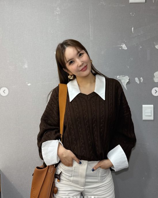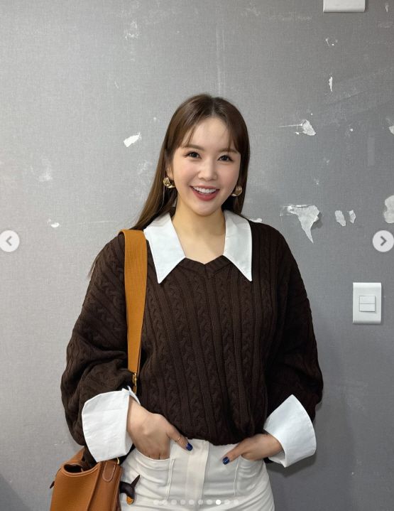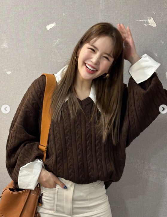 공개된 사진 속 장영란은 브라운 니트와 화이트 팬츠를 매치한 캐주얼한 차림으로, 자연스러운 포즈와 밝은 표정으로 카메라를 응시하고 있다.