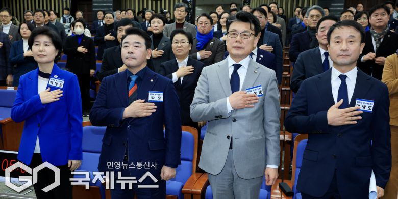 (서울=국제뉴스) 한병도(오른쪽부터), 진성준, 박정, 백혜련 더불어민주당 원내대표 후보자들이 11일 오후 서울 여의도 국회에서 열린 제22대 국회 더불어민주당 제2기 원내대표 선출 의원총회에서 국민의례를 하고 있다./사진=이용우 기자