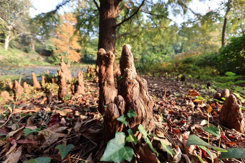 낙우송 ‘펜덴스’가 땅위로 노출한 공기뿌리. 천리포수목원 제공 |