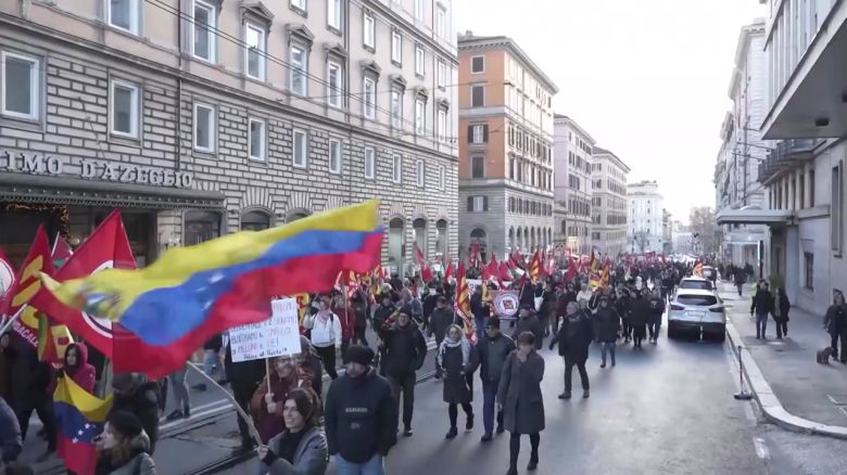 현지시간 10일 이탈리아 로마에 있는 미국 대사관 앞에서 천여 명이 집결해 미국을 규탄하고 베네수엘라 주권에 대한 존중과 니콜라스 마두로 대통령 부부 석방을 촉구했습니다.