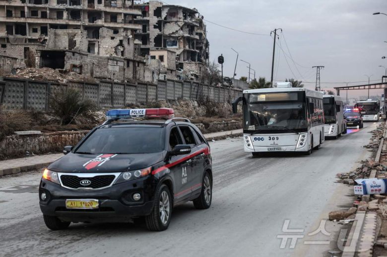 10일(현지시간) 시리아 북서부 알레포에서 쿠르드족 시리아 민주군(SDF)의 전투원을 태운 버스와 호송 차량이 시리아 북동부 지역으로 출발하는 모습. 2026.01.10 ⓒ AFP=뉴스1 ⓒ News1 김지완 기자 |