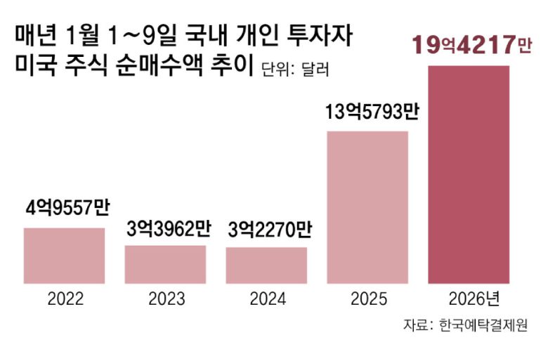 11일 한국예탁결제원에 따르면 국내 개인투자자는 이달 1일부터 9일까지 미국 주식을 19억4217만 달러(약 2조8000억 원)어치 순매수한 것으로 집계됐다. 지난해 같은 기간(13억5793만 달러)보다 43% 늘어난 것으로 관련 통계를 공개한 2011년 이후 가장 큰 규모다.
