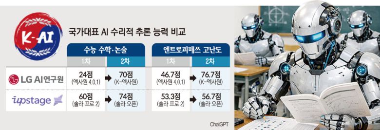 김 교수팀이 지난해 12월 15일 수능 수학∙논술 50문제를 풀게 한 결과 엑사원 4.0.1은 24점이었지만 최근 공개된 K-엑사원은 70점을 기록했다. 업스테이지의 솔라 프로 2(31B)는 60점이었지만 솔라 오픈 100B는 74점으로 높은 성능을 보였다.