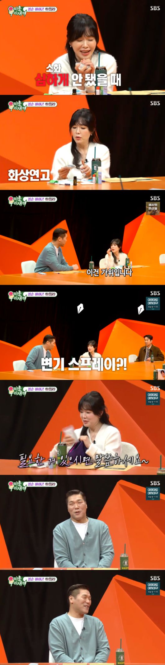 하희라는 “없을 때 꼭 찾을 일이 많아서 챙기기 시작했다. 주위 분들은 뭐만 없으면 저한테 온다”며 남다른 배려심을 드러냈다. 이에 MC 신동엽은 서장훈에게 “평소 변기 스프레이(냄새 제거제)를 가지고 다니냐”고 기습 질문을 던졌다.
