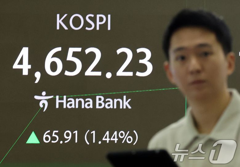 12일 오전 서울 중구 하나은행 딜링룸 전광판에 개장 시황이 나오고 있다. 이날 코스피 지수는 53.57포인트(1.17%) 오른 4586.32, 코스닥 지수는 0.56p(0.06%) 상승한 948.48, 원·달러환율은 3.7원 오른 1461.3원에 개장했다. 2026.1.12/뉴스1 ⓒ News1 황기선 기자 |