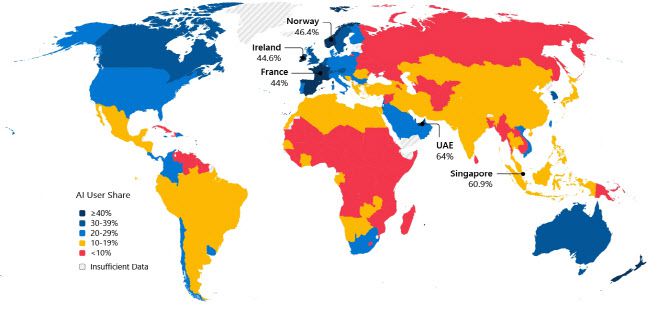 다만 지역 간 불균형은 더욱 뚜렷해졌다. 글로벌 노스의 채택률(24.7%)은 글로벌 사우스(14.1%)에 비해 두 배 가까이 높았으며, 두 지역 간 격차는 2025년 상반기 9.8% 포인트에서 하반기 10.6% 포인트로 확대됐다. 상위권 순위에서는 아랍에미리트와 싱가포르가 1, 2위를 유지한 가운데 노르웨이, 아일랜드, 프랑스, 스페인이 그 뒤를 이으며 안정적인 지형을 형성했다.