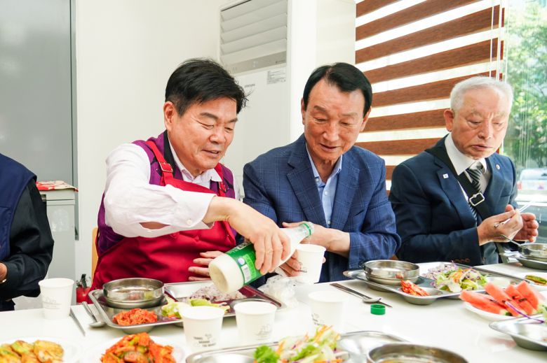 이필형 동대문구청장(왼쪽)이 보훈 가족 어르신에게 막걸리를 따라ㅏ 드리고 있다. 다른 두 명의 남성도 테이블에 앉아 음식을 먹고 있다.