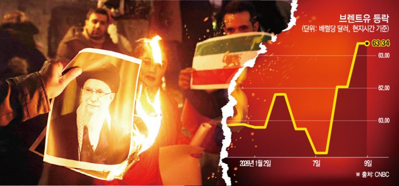 이란에서 사망자가 속출하고 트럼프 행정부가 움직이자 국제유가는 요동쳤다. 8~9일 이틀간 브렌트유는 5% 이상 급등하면서 배럴당 63달러를 넘어섰다. 삭소뱅크의 올레 한센 애널리스트는 “이란 시위가 점점 격화하면서 시장은 혼란을 우려하고 있다”고 말했다.