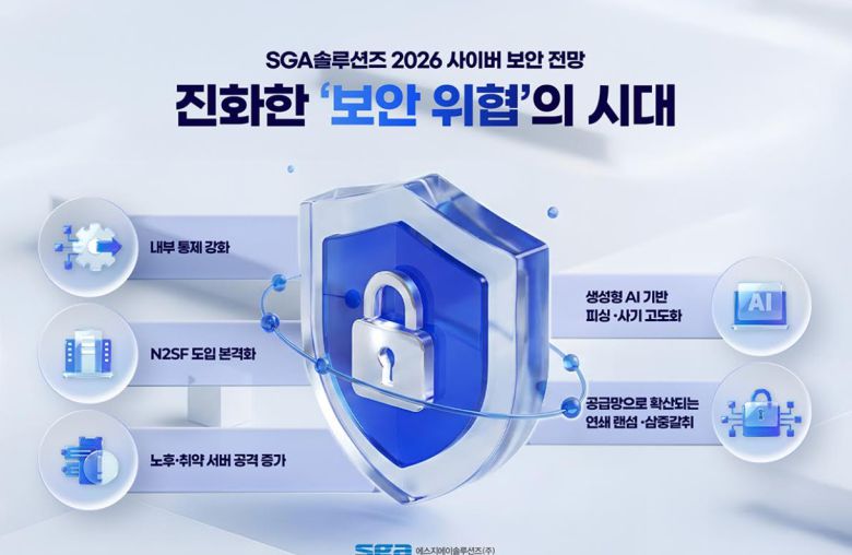 SGA솔루션즈가 제시한 ‘2026년 사이버 보안 5대 전망’은 ▲내부 통제 강화 ▲N2SF 도입 본격화 ▲노후·취약 서버 공격 증가 ▲생성형 AI 기반 피싱·사기 고도화 ▲공급망으로 확산되는 연쇄 랜섬·삼중갈취 등이다.