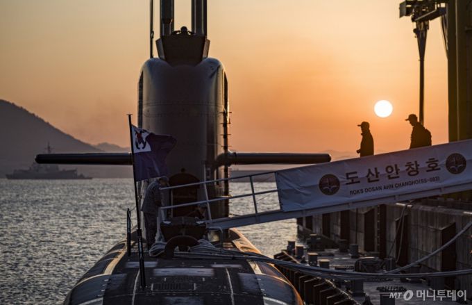 대한민국 핵심 국가전략부대인 해군 잠수함사령부 승조원들이 경남 진해시 해군 잠수함사령부에 정박된 국내 독자 설계·건조한 3,000톤급 잠수함 1번함 ‘도산안창호함’에서 떠오르는 태양 뒤로 연말 대비태세를 위해 출항 준비를 하고 있다. / 사진=뉴시스 |