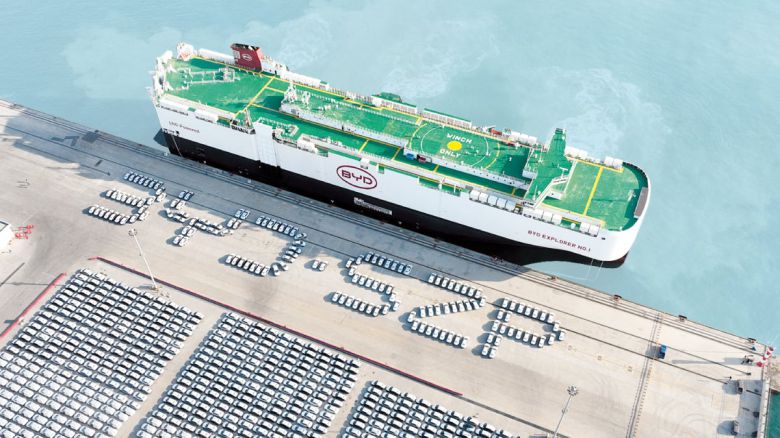 중국 전기차 기업 BYD의 첫 자동차 운반선 ‘BYD 익스플로러 1호’가 2024년 1월 14일 중국 광둥성 선전항에서 유럽으로 수출하는 전기차를 선적하기 위해 정박해 있다./연합뉴스 |