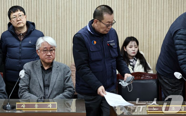 김정환 서울시버스운송사업조합 이사장(왼쪽)과 박점곤 서울시 버스노동조합 위원장이 12일 오후 서울 영등포구 서울지방노동위원회에서 열린 특별조정위원회 사후 조정회의에 참석하고 있다. 2026.1.12/뉴스1 ⓒ News1 구윤성 기자 |