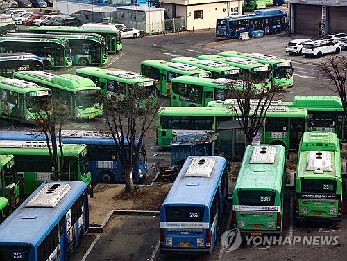 서울의 한 버스공영차고지에 시내버스들이 주차되어 있는 모습[연합뉴스 자료사진]