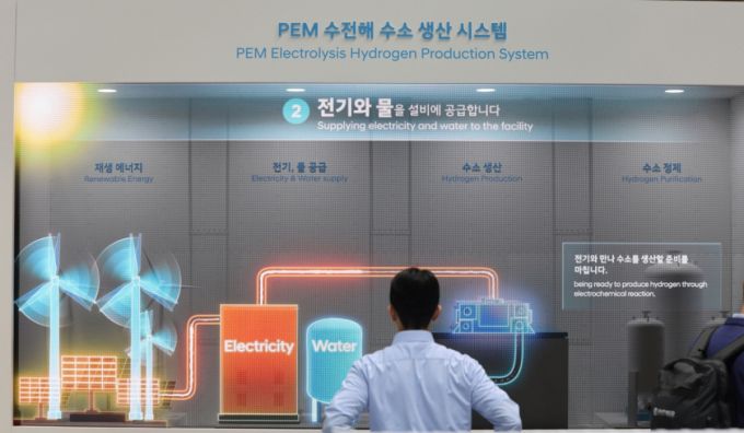 지난 12월 4일 경기도 고양시 일산서구 킨텍스(KINTEX)에서 열린 '세계 수소 엑스포 2025(월드 하이드로젠 엑스포)'에서 현대자동차 그룹 부스를 찾은 관람객이 PEM 수전해 수소 생산 시스템을 살펴보고 있다. /사진=뉴스1