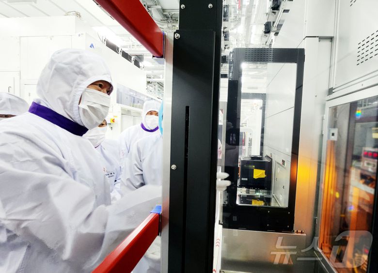 최태원 SK그룹 회장이 5일 SK하이닉스 주요 경영진과 함께 SK하이닉스 이천캠퍼스 HBM 생산현장을 점검하고 있다.(SK그룹 제공) ⓒ News1 최동현 기자