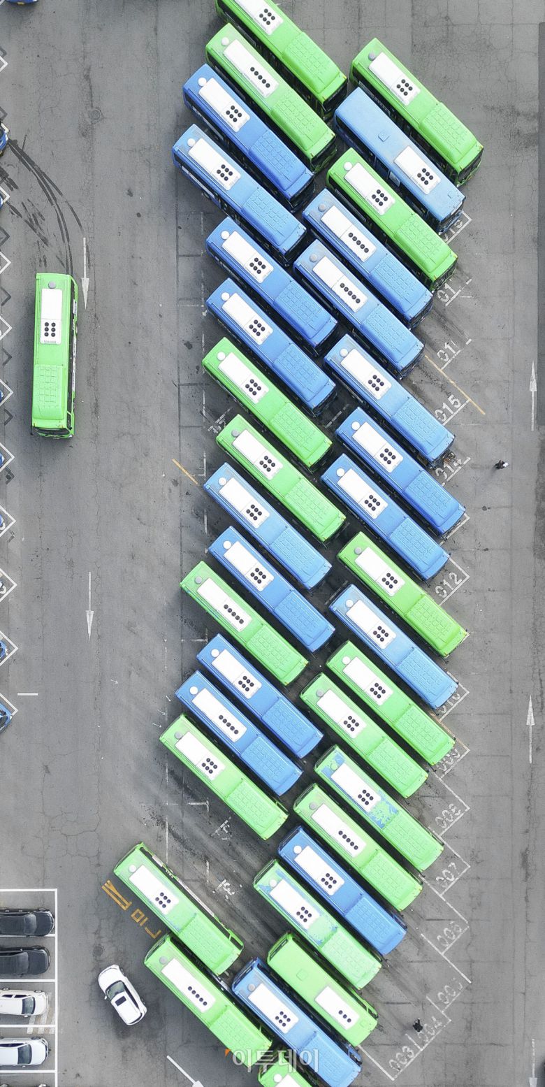 서울 버스노조가 13일 첫차부터 총파업을 예고한 가운데 12일 서울 은평구 진관공영차고지에 시내버스들이 줄지어 세워져 있다. |