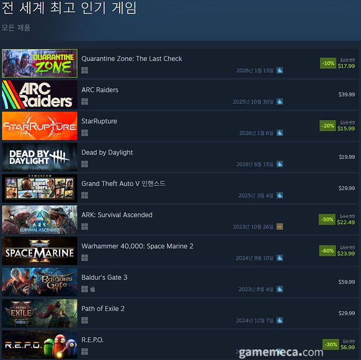 그 외에는 아크: 서바이벌 어센디드가 6위에 올랐다. 겨울 할인부터 50% 할인을 이어가고 있는데, 지난 10일 2027년까지의 로드맵을 공개하고 게임 엔진 업그레이드 계획, DLC 대규모 업데이트 일정 등 공지가 순위에 영향을 준 것으로 보인다.
