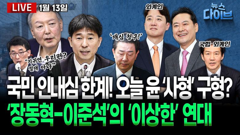 출연: 양지열 변호사, 박영식 시사평론가, 오윤혜 방송인, 신인규 변호사, 권태호 한겨레 논설실장, 진행: 고현준. 이 대통령의 ‘실용외교’ 릴레이! 이번엔 한-일 정상회담 / 지귀연이 방치한 ‘침대변론’... 오늘 윤 ‘사형’ 구형 나오나? / 끝까지 반성은 없었다... 15년 구형받은 이상민 / 김건희 메모장 확보...나경원 낙마·김기현 움직인 ‘정치 바둑판’ / 이 대통령 “당 의견 수렴” 지시... 논란의 검찰개혁 법안! 향방은? / 김병기 ‘제명’ 징계에 ‘재심 청구’로 반발 / 연대는 하나 지방선거 연대는 없다? 장동혁-이준석 ‘기묘한 연대’ 오늘 (1월 13일) 뉴스 다이브 많은 시청바랍니다.