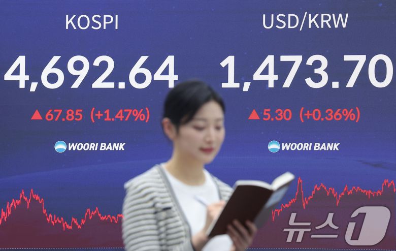 (서울=뉴스1) 김성진 기자 = 13일 오후 서울 중구 우리은행 본점 딜링룸 전광판에 증시 표시가 나오고 있다. 이날 코스피 지수는 전거래일 대비 67.85(1.47%) 포인트 상승한 4,692.64로 장을 마감했다. 코스닥은 전일 대비 0.83p(0.09%) 하락한 948.98로 마감했다. 서울외환시장에서 달러·원 환율은 전일 오후 3시 30분 주간종가 대비 5.3원 오른 1473.7원에 마감했다. 2026.1.13/뉴스1