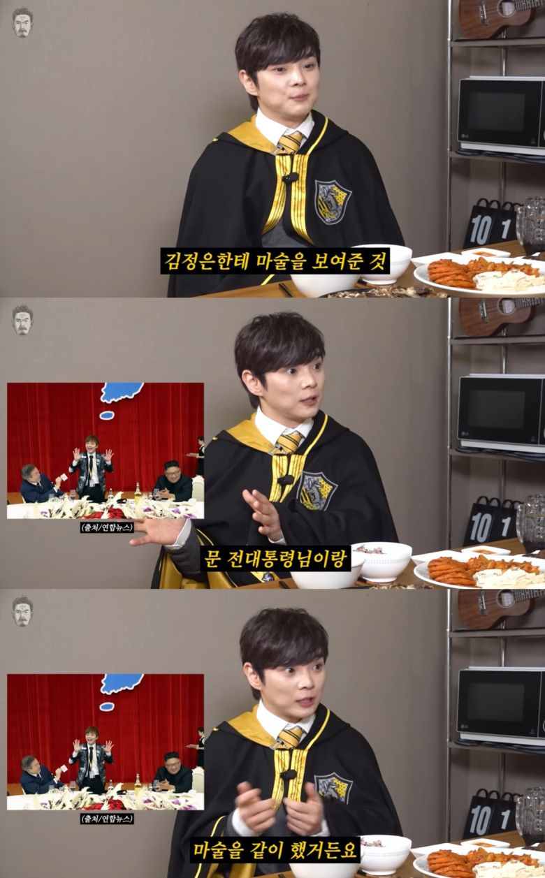 이날 꼰대희는 최현우에게 30년 간 마술을 하며 가장 기억에 남는 순간을 물었다. 이에 최현우는 "제가 평양에 가서 김정은에게 마술을 보여줬다. 정상회담 때 가서 문재인 전 대통령과 김정은 중간에서 같이 마술을 했다"고 운을 뗐다.