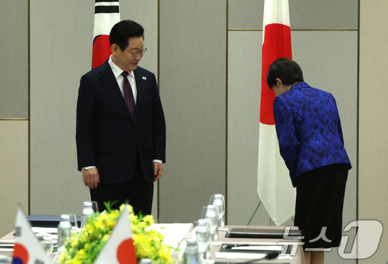 다카이치 사나에 일본 총리가 13일 일본 나라현 한일 정상회담장에서 이재명 대통령과 악수 후 자리로 향하기 전 국기에 예를 표하고 있다. 2026.1.13/뉴스1 ⓒ News1 이재명 기자