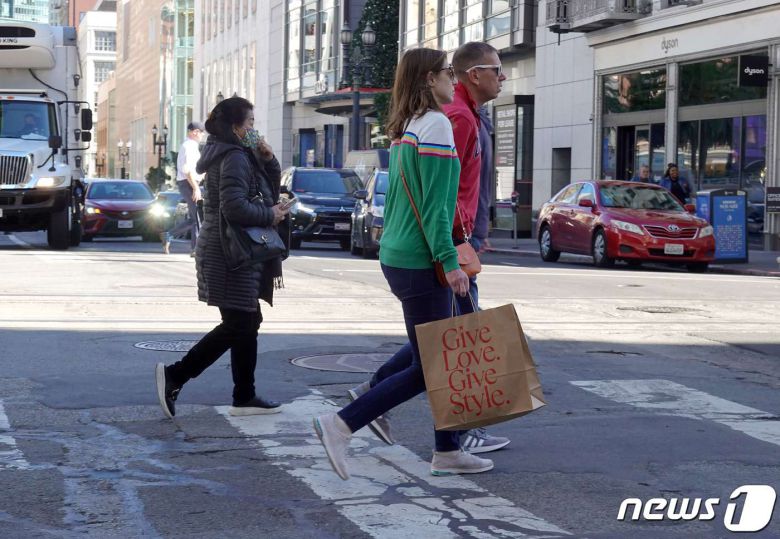 미국 캘리포니아주 샌프란시스코 유니언 스퀘어에서 쇼핑객들이 거리를 건너고 있다. 2022.11.17. ⓒ AFP=뉴스1