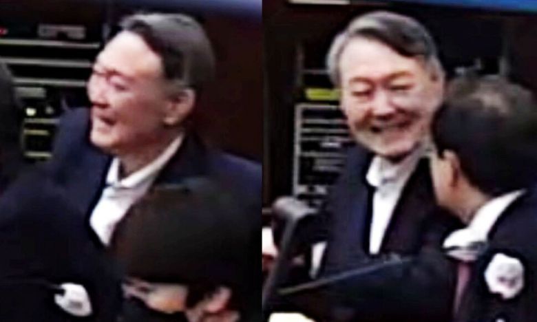 윤 전 대통령은 옆자리에 앉은 윤갑근 변호사와 시종일관 귓속말을 나누는가 하면 이따금씩 이를 드러내어 함박웃음을 지었다. 김 전 장관은 휴정 시간에 “장관님, 너무 귀여워”라는 방청석 지지자들에게 ‘손하트’를 날렸다. 윤 전 대통령은 조은석 특별검사팀의 최종의견 진술이 이어질 때조차 활짝 웃어 보였다.