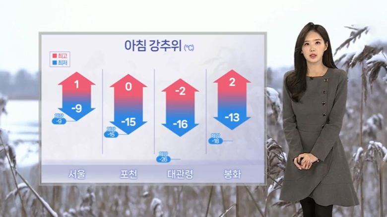 자세한 기온 살펴 보시면 서울 영하 9도, 고양 영하 11도, 춘천 영하 15도까지 떨어지겠고 늦은 오후부터 수도권과 강원에 약한 눈이나 비가 내리겠습니다.