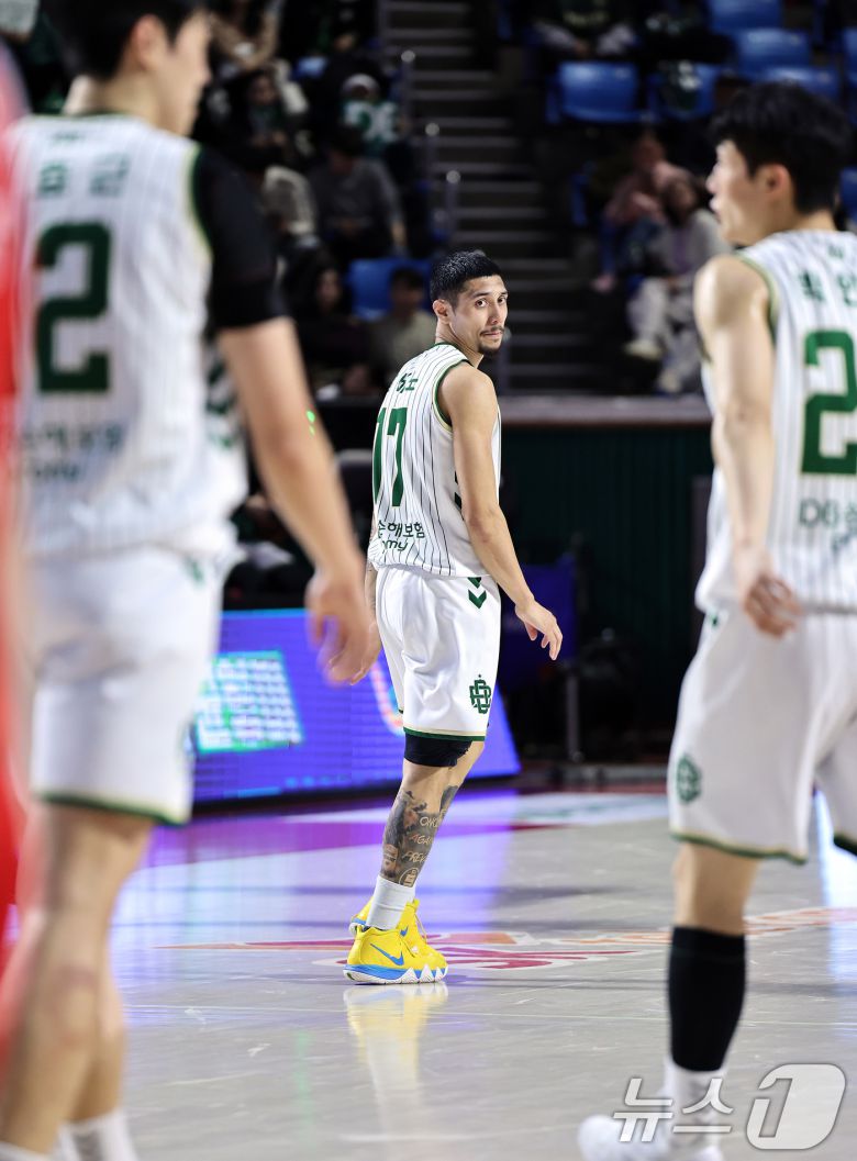 (서울=뉴스1) 구윤성 기자 = 13일 오후 서울 송파구 잠실학생체육관에서 열린 '2025-2026 LG전자 프로농구 정규리그' 서울 SK 나이츠와 원주 DB의 경기에서 DB 이선 알바노가 득점에 실패하자 아쉬워하고 있다. 2026.1.13/뉴스1