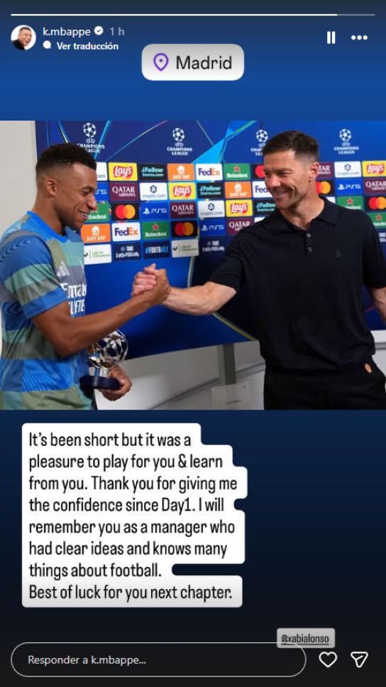 음바페는 자신의 SNS에 알론소 감독과 두 손을 맞잡은 사진을 게시하며 "짧은 시간이었지만 당신을 위해 뛰고 당신에게서 배울 수 있어 기뻤다. 첫날부터 나를 믿어줘서 고맙다"라고 적었다.