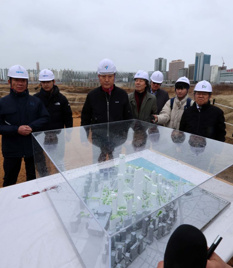 오세훈 서울시장이 용산국제업무지구가 들어설 서울 용산정비창 부지 현장을 둘러보고 있다. 신태현 기자 holjjak@