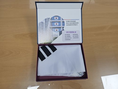 태극기보관함에는 '나라와 태극기를 사랑하는 마음을 모아 결혼을 축하합니다'라는 축하 문구가 새겨져 있으며, 게양 방법과 게양일 안내도 담겨있다.