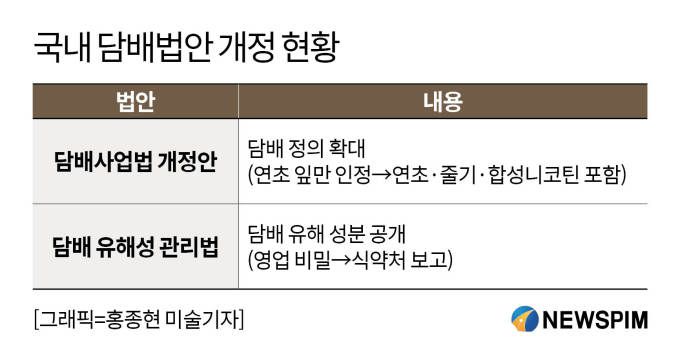 해외에서 담배 회사들의 패소가 이어지는 가운데 한국 정부도 흡연과 질병 발생의 기전을 인정해 담배 규제를 강화하고 있다. 기존 '담배사업법'에 따르면, 담배는 연초의 잎을 원료로 한 것만 해당됐다. 그러나 액상형 전자담배의 원료인 합성니코틴을 '담배'로 규정하는 담배사업법 개정안이 최근 국회를 통과해 시행될 예정이다.
