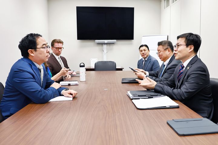 [서울=뉴시스] 여한구 산업통상부 통상교섭본부장이 13일(현지 시간) 미국 워싱턴 D.C. 의회에서 앤디 킴 상원의원과 면담하고 있다. (사진=산업통상부 제공) 2026.01.14. photo@newsis.com *재판매 및 DB 금지