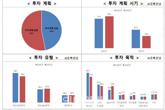 14일 한국중견기업연합회가 실시한 ‘2026년 중견기업 투자 전망 조사’에 따르면 중견기업의 절반 가량인 46.9%는 올해 투자 계획이 있다고 답했다. 이 가운데 투자 규모를 전년대비 확대하거나 유지하겠다는 응답은 83.6%, 전년보다 줄이겠다는 기업은 16.4%였다.