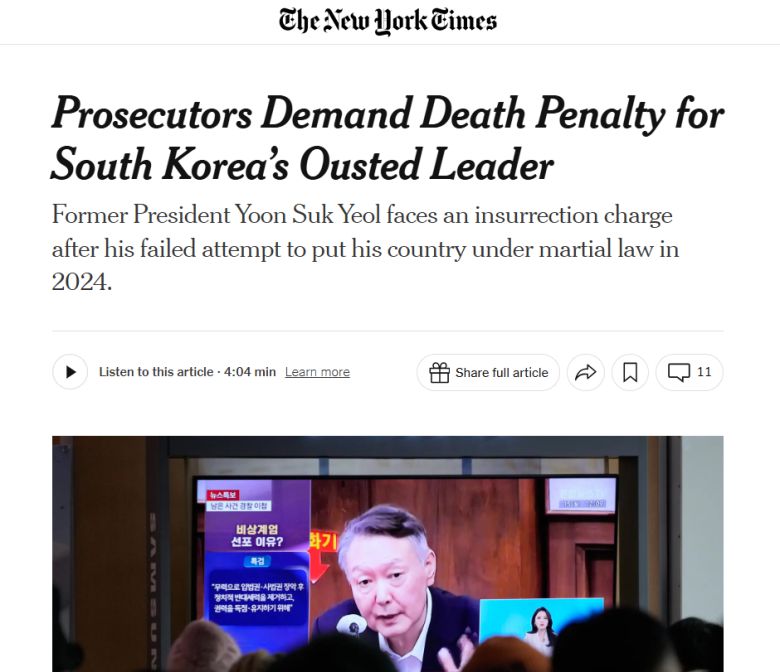 윤석열 전 대통령에게 법정 최고형인 사형이 구형되자 뉴욕타임스(NYT)와 가디언, AP통신 등 주요 외신들이 비중 있게 소식을 전했다.