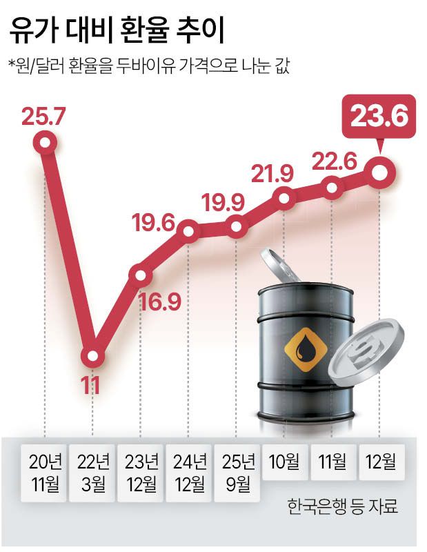 14일 한국은행과 한국석유공사·서울외국환중개 등에 따르면 지난 12월 평균 원/달러 환율과 두바이유 가격의 격차(환율을 두바이유 가격으로 나눈 값)는 23.6을 기록했다. 이는 2020년 11월(25.7) 이후 5년 1개월 만에 가장 높은 수준이다.