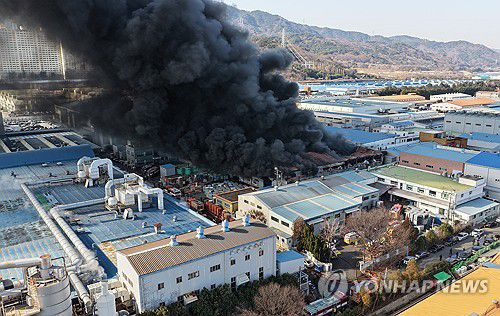 창원 국가산단 내 공장 화재(창원=연합뉴스) 김동민 기자 = 14일 오전 10시 13분께 경남 창원시 성산구 성주동 국가산업단지 내 한 공장에서 불이 나 검은 연기가 발생하고 있다.     인명피해는 현재까지 없는 것으로 전해졌다. 2026.1.14 image@yna.co.kr