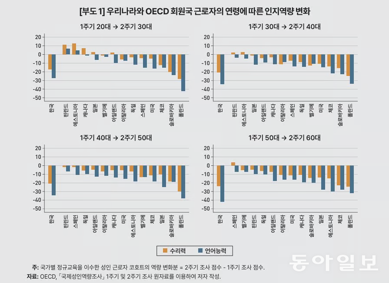 14일 한국개발연구원(KDI)는 이 같은 내용이 담긴 ‘근로자 인지 역량의 감소 요인과 개선방안’ 보고서를 발표했다. 보고서에 따르면 20, 30대 노동자의 문해력과 수리력 등 인지능력은 경제협력개발기구(OECD)의 평균 이상이었다. 2011~2012년 조사에선 한국 25~29세 근로자의 수리력과 문해력이 OECD 17개국 중 각각 6위와 4위를 차지하기도 했다. 그러나 40대 초반 근로자의 수리력과 문해력 점수는 20대 후반과 비교해 각각 14.10점, 18.94점 낮았다. 반면, OECD 국가들이 평균 6.86점, 4.23점 떨어졌다.