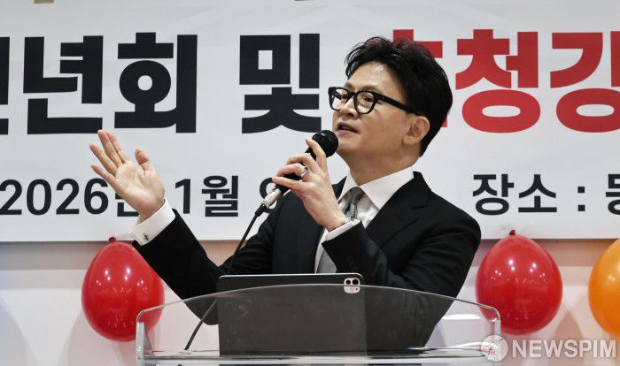 [서울=뉴스핌] 양윤모 기자 = 한동훈 전 국민의힘 대표가 9일 오후 동대문 아르코에서 개최된 국민의힘 동대문을 당협(위원장 김경진 전 의원)이 주최한 2026 신년인사회에 참석해 강연을 하고 있다.  한 전 대표는 최근 장동혁 국민의힘 대표의 계엄 사과와 쇄신안에 대해 "윤어게인 절연 없는 계엄 극복은 허상"이라고 지적했다. 2026.01.09 yym58@newspim.com