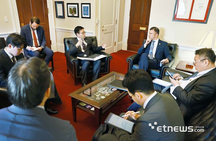 여한구 산업통상부 통상교섭본부장이 13일(현지시간) 미국 워싱턴 DC 의회에서 루디 야킴(Rudy Yakym) 하원의원과 면담을 갖고, 우리의 국내 디지털 입법 동향에 대해 설명하고 미국 측이 제기하는 우려 등을 청취했다. 산업부 제공