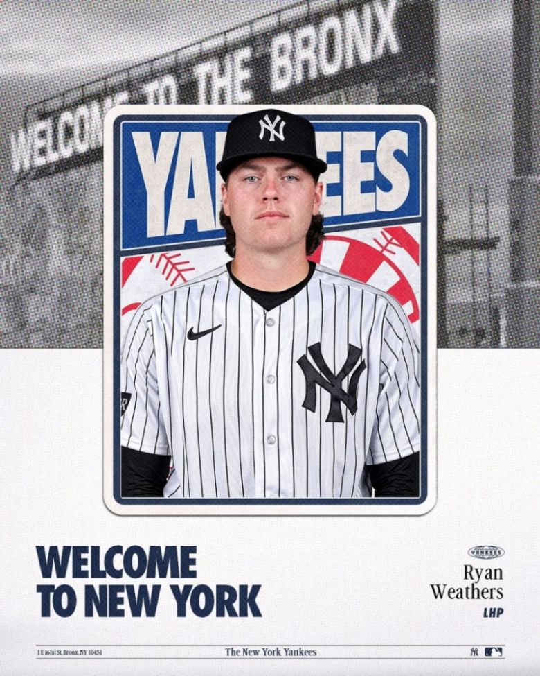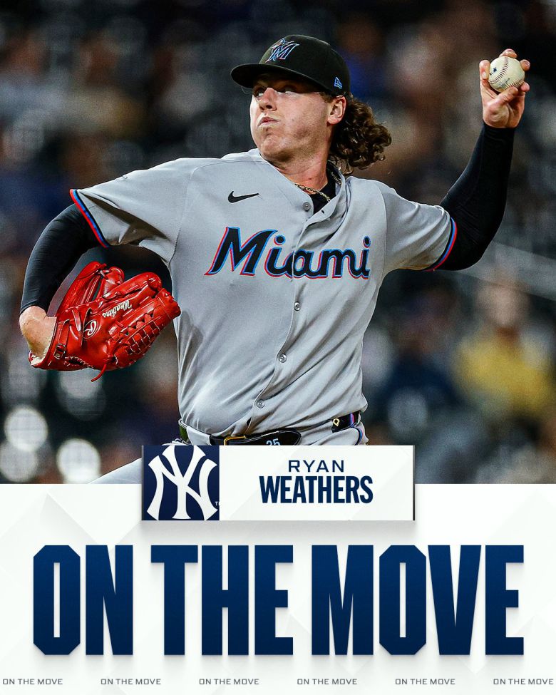 메이저리그 공식 홈페이지 MLB.com은 14일(한국시간) "양키스가 2026시즌 초반 선발진 공백이 예상되는 상황에서 전력 보강에 나섰다. 마이애미와의 트레이드를 통해 웨더스를 영입하면서 유망주 4명을 내줬다"고 보도했다.