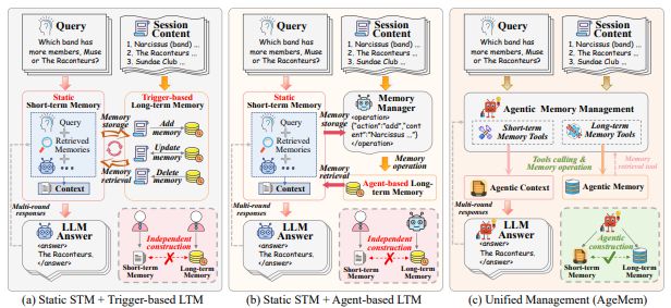 알리바바와 중국 우한대학교 연구진은 12일 장기 기억과 단기 기억을 분리해 관리하던 기존 방식에서 벗어나, 기억 관련 작업을 언어 생성과 같은 '행동 공간(action space)' 안에 통합한 새로운 프레임워크 '에이지멤(Agentic Memory, AgeMem)'을 온라인 아카이브를 통해 공개했다.