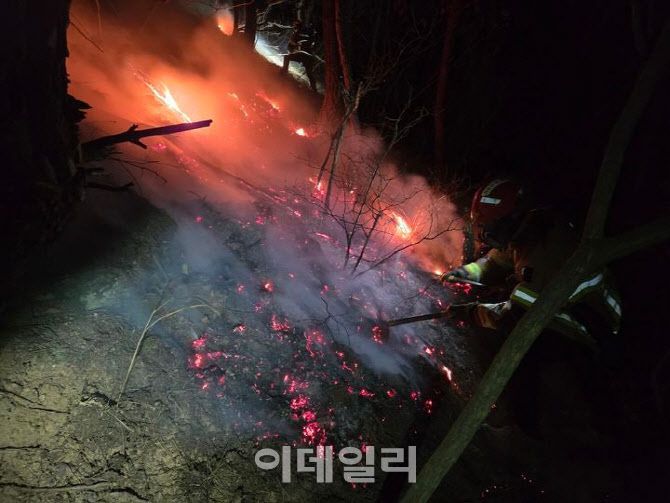 경북 소방산불진화대가 최근 발생한 의성읍 비봉리 일대 산불 현장에 투입돼 산불 초기 진화와 확산 차단에 나서고있다.(사진=경북도 제공) |
