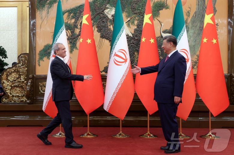 2025년 9월 2일 중국 베이징에서 시진핑 중국 국가주석(오른쪽)과 마수드 페제시키안 이란 대통령이 회담하는 모습. 2025.09.02 ⓒ 로이터=뉴스1 ⓒ News1 이지예 객원기자
