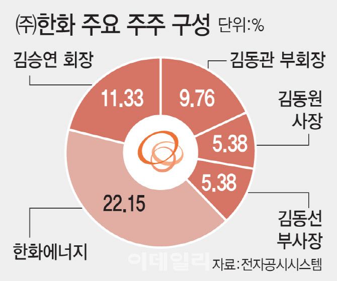재계 관계자는 “이미 주 김 회장의 세 아들 중 김동관 부회장으로 최대주주가 정해진 상황에서 이번 인적 분할을 계기로 삼형제 간 분리 경영이 가속화될 가능성이 있다”며 “한화에너지의 기업공개(IPO)가 이뤄지면 김동관 부회장이 지주사 지분율을 극대화할 것으로 보인다”고 말했다.