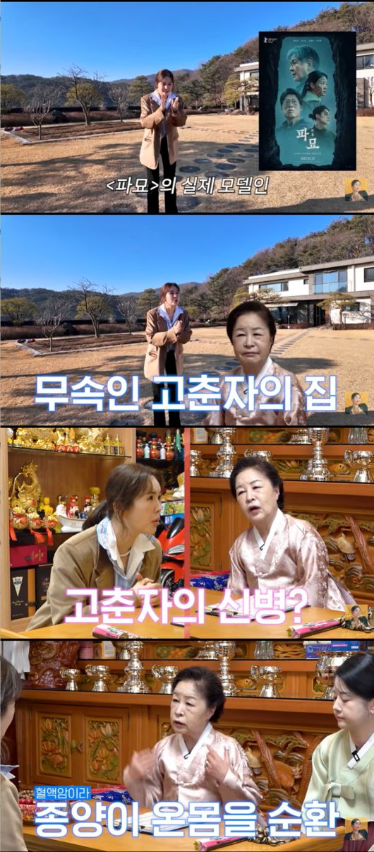 [OSEN=박근희 기자] 방송인 장영란이 최근 영화 '파묘'의 실제 모델로 알려진 40년 경력의 베테랑 무속인 고춘자의 집을 방문했다.